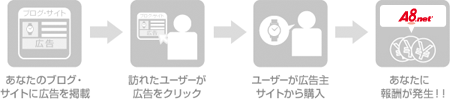 アフィリエイトとは・・・自分のホームページ・ブログなどに広告を貼って報酬を得る仕組みです。